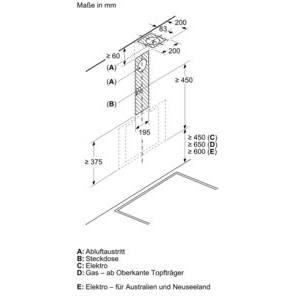 • Gemäß EN 61591 und EN/IEC 60704-2-13 kann Ihr Gerät im Abluftbetrieb folgende Werte erreichen: Stufe 1: Lüfterleistung 220 m3/h; Geräuschwert 46 dB (A) re1pW Stufe 2: Lüfterleistung 315 m3/h; Geräuschwert 53 dB (A) re1pW Stufe 3: Lüfterleistung 430 m3/h; Geräuschwert 60 dB (A) re1pW Intensivstufe 1: Lüfterleistung 550 m3/h; Geräuschwert 65 dB (A) re1pW