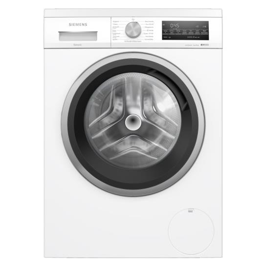 Weiße Waschmaschine von Siemens mit runder Tür und digitalen Bedienelementen. Die Trommel ist innen sichtbar.