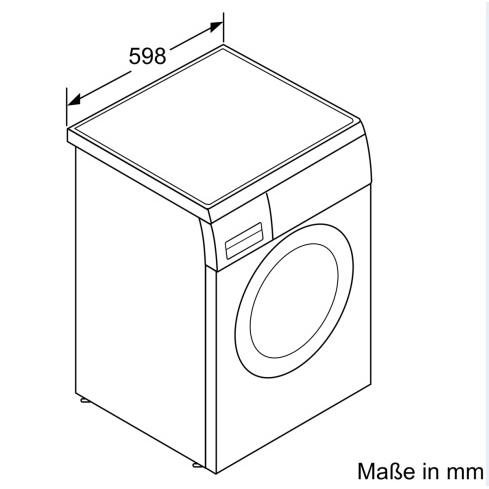 Zeichnung einer Waschmaschine von vorne, mit sichtbarer Tür und Bedienelementen. Maßangabe 598 mm oben. Füße unten.