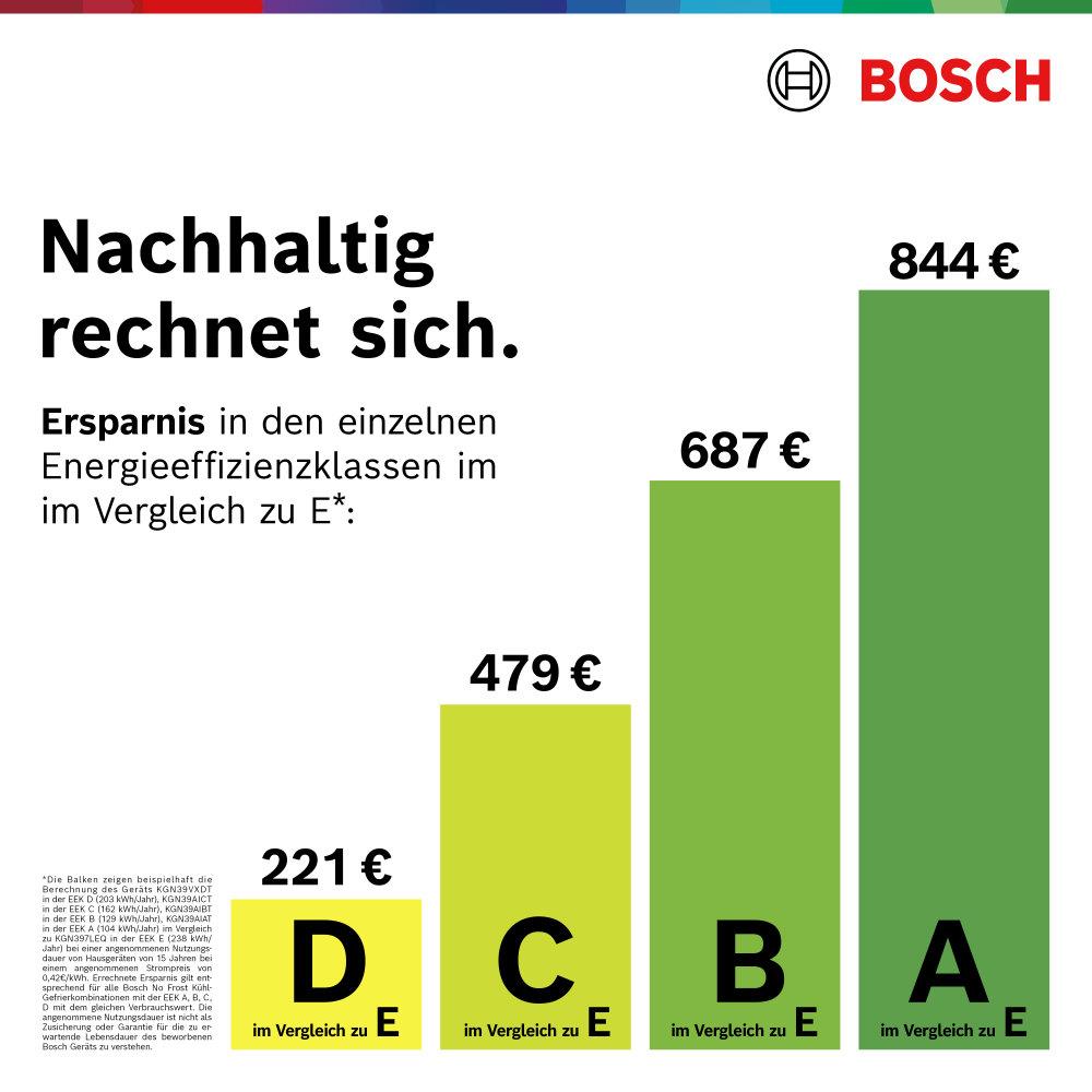 Grafik zeigt Energieeffizienzklassen A bis D mit Preisangaben und Vergleich zu E. Bosch Logo oben rechts.