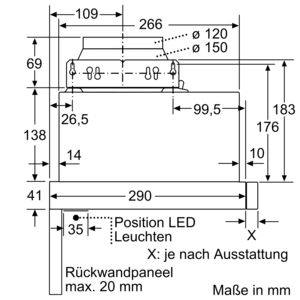 • Abluftausgang Ø 150 mm (Reduzierstück Ø 120 mm beiliegend)