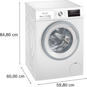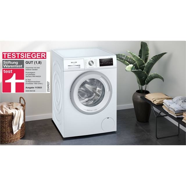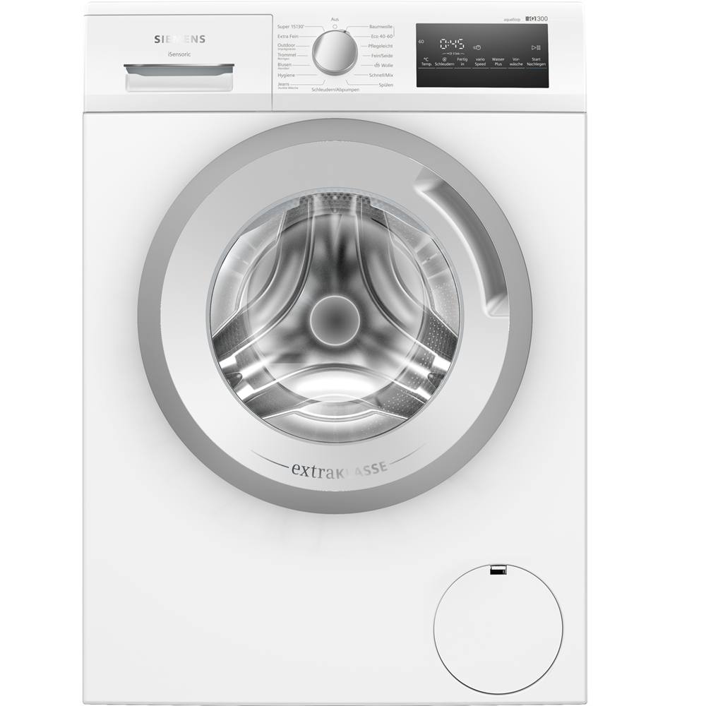 Weiße Frontlader-Waschmaschine von Siemens. Rundes Bullauge, Bedienelemente oben rechts, digitales Display.