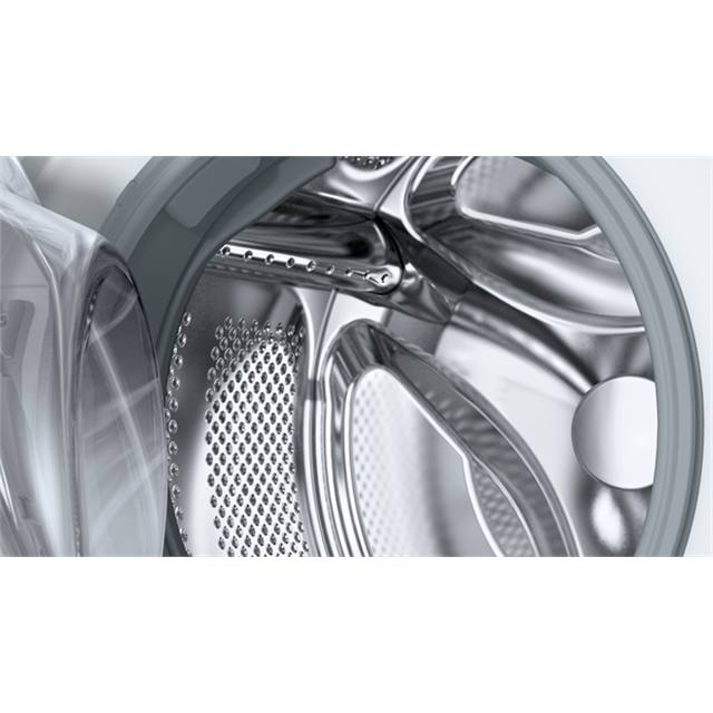 Nahaufnahme einer Waschmaschine. Im Inneren ist die Trommel mit einer silberfarbenen Oberfläche und Löchern zu sehen.